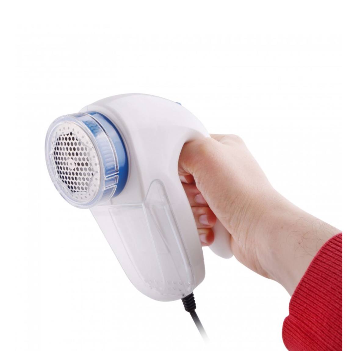 Машинка срезает катышки специальными вращающимися лезвиями. Для сбора срезанных катышков в машинке предусмотрен специальный контейнер, который можно снять и почистить. Удобная эргономичная ручка.