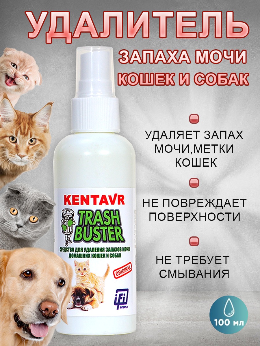 KENTAVR BUSTER - Нейтрализатор запаха животных (кошек, собак, кроликов). Без Хлора! Trash Buster не маскирует запах, как другие средства, а разлагает саму молекулярную составляющую запах. Средство содержит дезинфицирующие компоненты. Можно обрабатывать ковровые и текстильные покрытия. Безопасно для животных. Ликвидатор запаха мочи и меток. Расщепляет биологические ферменты животных, такие как: • Моча • Слюна • Метки • Другие биологические отложения животных. Антигадин для кошек и собак. 100мл