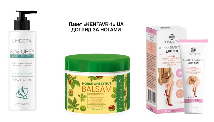 Пакет «KENTAVR-1» ДОГЛЯД ЗА НОГАМИ Гель-кератолітик для видалення загрубілої шкіри і натоптишів Livesta, 200 мл+Бальзам з екстрактом кінського каштану LIVESTA, 500 мл+Крем-бальзам для вен з екстрактом п'явки LIVESTA, 75 мл