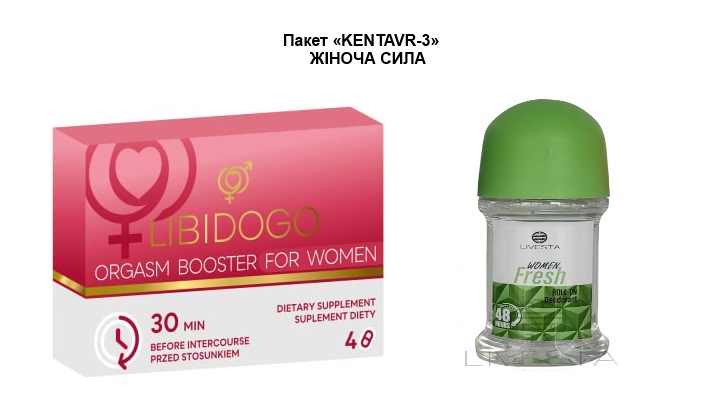 Пакет «KENTAVR-3» ЖІНОЧА СИЛА Дієтична добавка для підвищення лібідо у жінок LIBIDOGO, 4 капсули+Жіночий роликовий дезодорант Livesta Fresh, 50 мл