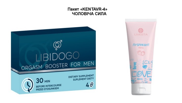 Пакет «KENTAVR-4» ЧОЛОВІЧА СИЛА Дієтична добавка для підвищення лібідо у чоловіків LIBIDOGO, 4 капсули+Гель-лубрикант Livesta, 75 мл