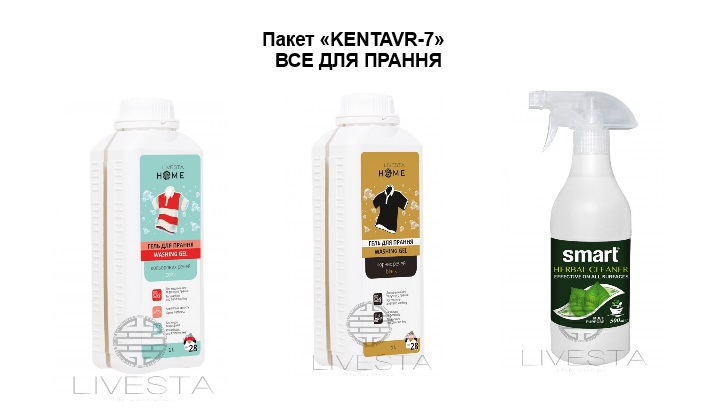 Пакет «KENTAVR-7» ВСЕ ДЛЯ ПРАННЯ Гель для прання чорних речей LIVESTA, 1000 мл+Гель для прання кольорових речей LIVESTA, 1000 мл+Універсальний рослинний очисник Smart, 500 мл