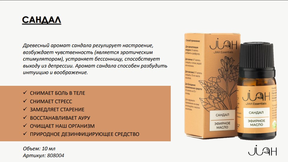 Эфирное масло САНДАЛ 100% натуральный состав Объем: 10 мл.
